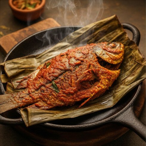 3. Place the fish on a wilted banana leaf, cover with the masala, wrap it tight, and slow-grill on a tawa until the leaf turns charred and fragrant.